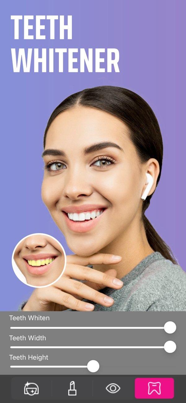 The teeth whitening tool in Selfie Editor helps you brighten your smile with little effort. It has adjustable settings, so you can choose how much whitening you want for a natural result. This feature works well for selfies and portraits.